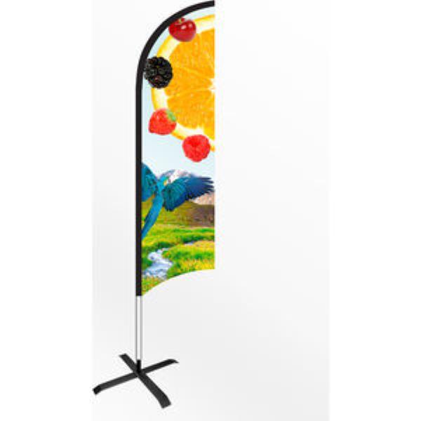 Strong Feather Flag System with Durable Aluminium Metal Click Frame Making It Simple& Easy to Assemble. Lightweight for Indoor & Outdoor Use. Heavy Duty Elasticated Sleeve Excellent Print Quality. Includes Aluminium Metal Pole Kit Single Sided Printed Flag (mirror Image on Reverse) & Cross Base. Other Bases Are Available. Height: 415cm Print Size: 90 x 375cm Printed Full Colour.