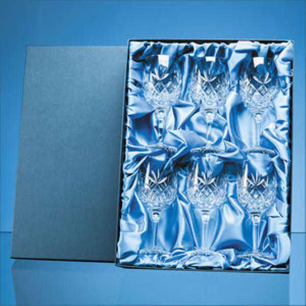 Elegant sophisticated stylish. This 6 piece Blenheim lead crystal gift set of 280ml long stemmed goblets is cut in a traditional diamond and wedge pattern and is the perfect gift to toast any occasion. The ideal size for a generous glass of white wine it is off-set in a luxurious satin lined presentation box. The perfect choice for an award or any gifting occasion it fits perfectly with other pieces from the Blenheim collection. Print method offered on the product is Sandblast Engraving. Also available Colour Infill print method contact us for details.