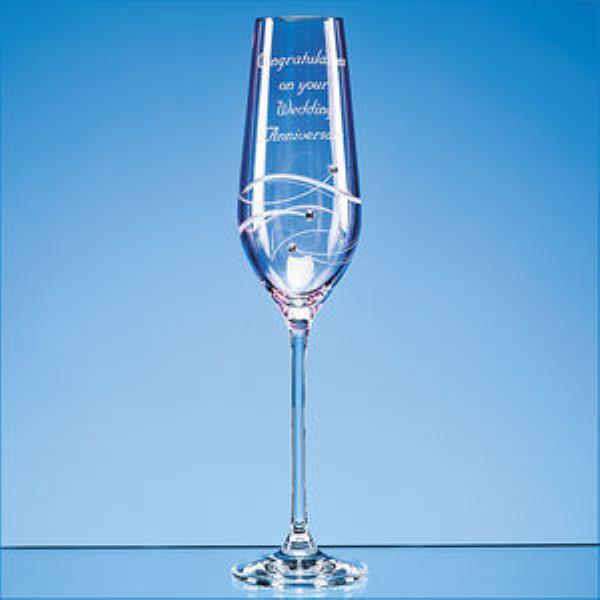 An elegant, long stemmed champagne flute with a romantic pink tint is the perfect gift or memento for an engagement, wedding, birthday or anniversary. Finished beautifully with a delicate spiral cut pattern and three sparking Swarovski Diamante crystals there is space to personalise this gift with the engraving of an inscription, message or date. To make it extra special, why not order with a beautiful presentation box lined with satin?