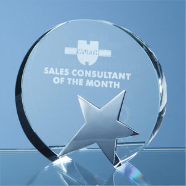 The circle award is simple in design but very stylish, it is hand crafted out of perfectly clear optical crystal and has a silver plated star bonded to the front to make an award well worth winning. The awards are available in 3 sizes and benefit from a large engraving area on the front of the circle can be personalised with any crest, logo or wording to create an award that is sure to take pride of place when put on display at home or at work. It is an ideal recognition, achievement or incentive gift and is supplied in a black foam lined presentation box. Print method offered on the product is Decal(Low Fire Colour Printing), Sandblast Engraving. Also available Colour Infill print method contact us for details.