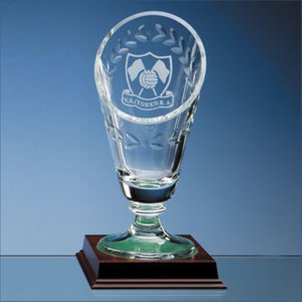 The plain footed vase has a laurel design cut and polished on the side of the vase giving it a unique engraving panel on the back which can be engraved with a crest or logo. There is also room to engrave on the front of the vase below the laurel design. Available in 3 sizes, the vase is ideal as 1st, 2nd and 3rd place prizes. Print method offered on the product is Decal(Low Fire Colour Printing), Sandblast Engraving. Also available Colour Infill print method contact us for details.