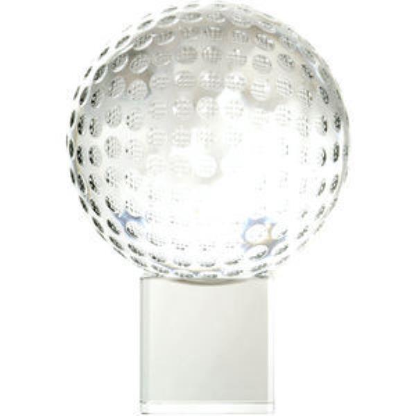 100mm crystal golf ball on a clear cube, 145mm high supplied in a satin lined box. This is a two piece trophy where the cube has an indent which the golf ball sits into.