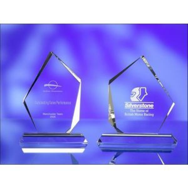 Optical Crystal Glass Award. Size: 200 x 180 x 70mm. Complete with a presentation box. Also available in a larger size. Engraving set up charges apply.