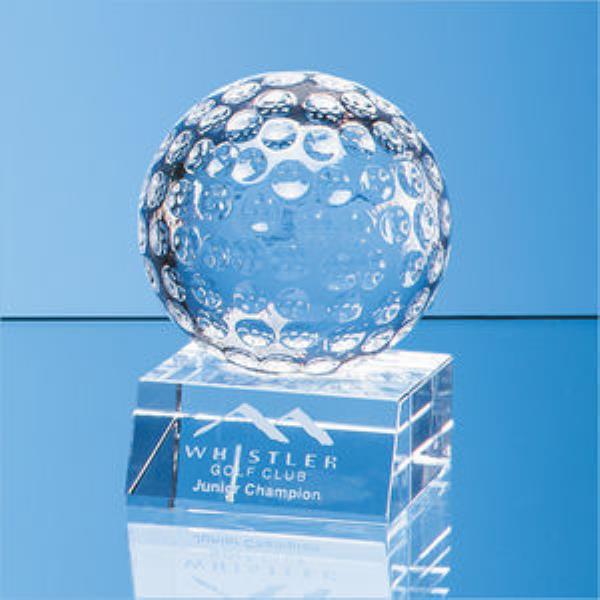 Perfect for the golfing enthusiast this item makes a great recognition award or incentive. A crystal golf ball sits on top of a perfectly clear optical crystal base which provides the space to convey your message club crest or corporate logo. The compact size of these awards means they look just as good when used as a desktop gift as they would sitting on the shelf in a trophy cabinet. With three sizes available you can reward first second and third places. Each award is supplied in an individual foam lined presentation box. Print method offered on the product is Sandblast Engraving. Also available Colour Infill print method contact us for details.