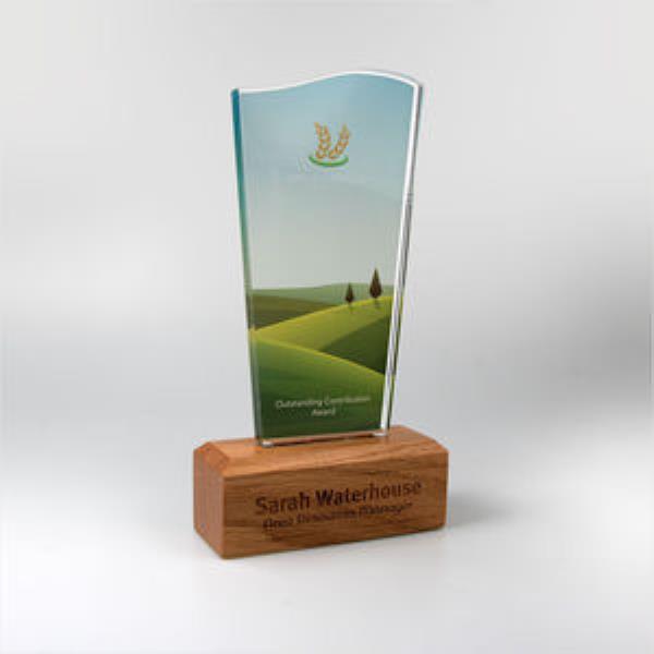 10mm thick clear acrylic upright award in 6 standard shapes with 45mm deep plain oak base, oblong or oval. Wood supplied with satin oil & wax finish. Reverse print the acrylic with full colour logos with personalisation laser engraved or printed to the front surface of the real wood base. 95x175mm. Shapes available for the acrylic; Oblong, Wave, Flame, Wedge, Sail, Arch. NO MOQ. Call off stock & monthly administration systems are available for ongoing requirements.