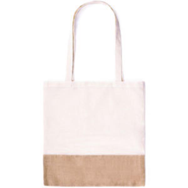 Ecofriendly bag in a resistant combination of natural materials jute and cotton of 245g/m2. Attractive, bicolour design and stitched finishing. 70cm, reinforced, long handles and resistance up to 8kg weight.