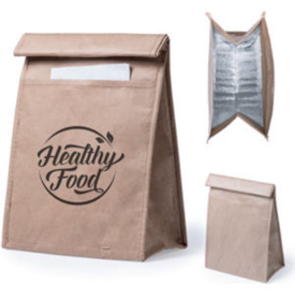 Thermal bag in moist resistant paper of 85g/m2. Isothermal inside in aluminum finishing, with outside pocket and velcro closure. 2.3 liters capacity.
