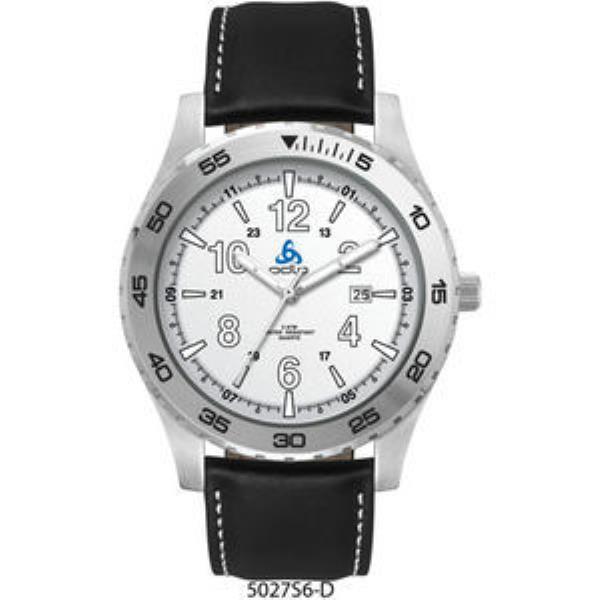 Alloy case, 2-tone silver dial with white printed indexes, padded black natural leather strap w/white stitching