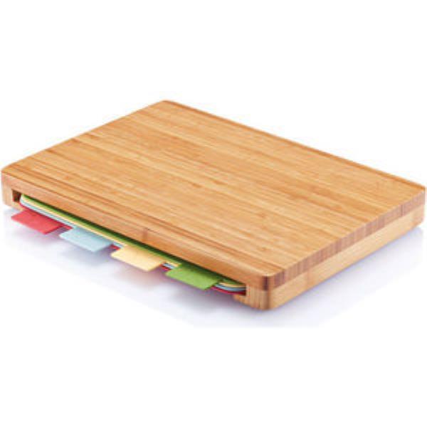 Trendy hygienic cutting board set. Dark bamboo cutting board 35x25cm, also functions as storage case for 4 hygienic PP dishwasher safe cutting boards. Colour and icon indicates for what type of food the boards should be used.