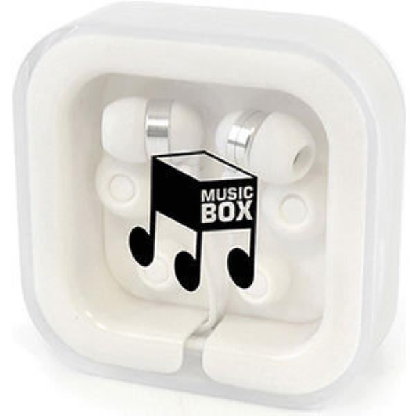 In ear headphones with 3.5mm headphone jack with 1.3m long cord. Earphones are white and housed in a white square plastic case with transparent lid.