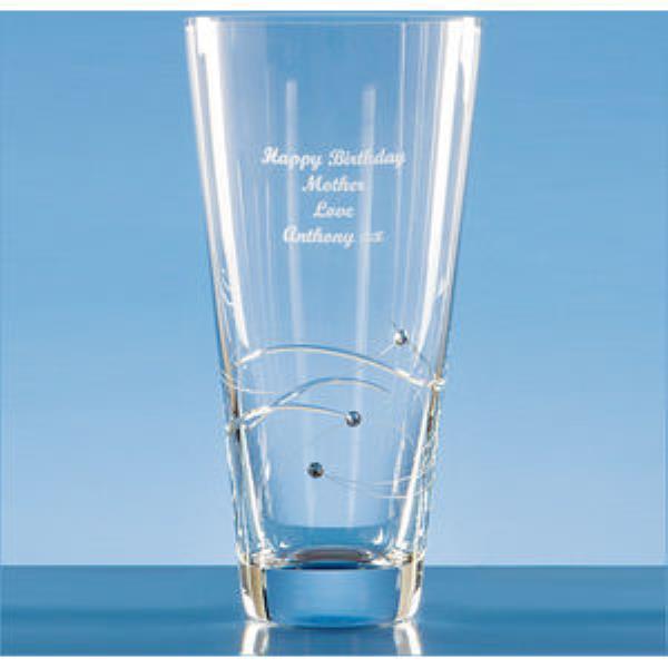 This conical vase has a spiral detail with 3 Swarovski crystals bonded to the side of the vase. There is an engraving area that can be personalised with any logo, crest or wording making it the perfect keepsake gift for any special occasion or achievement. The vase is also available in 20cm and 30cm. Print method offered on the product is Sandblast Engraving. Also available Colour Infill print method contact us for details.