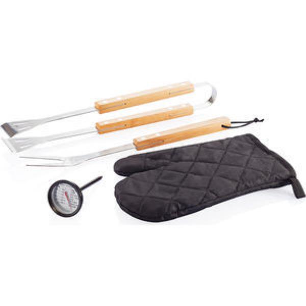 4 pcs bbq set with stainless steel spatula and tongs, bbq glove and meat thermometer.