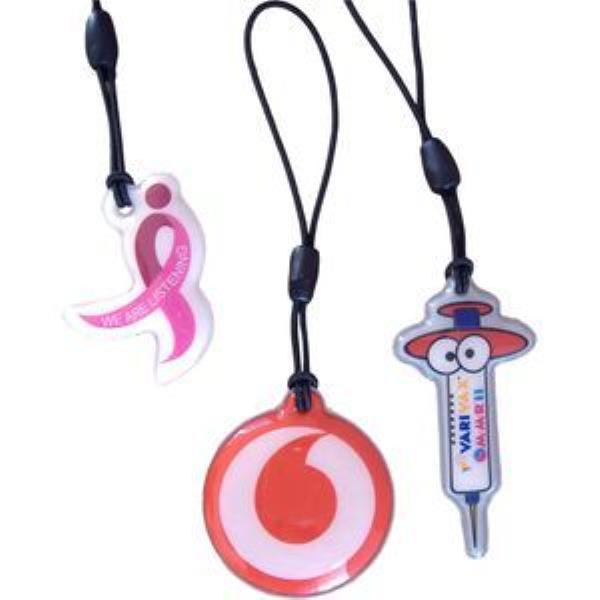 Welded pvc phone charm, with microfibre back for cleaning phone screens or other small lcd dispays. The front is reverse printed so that it does not wear off, and these can be made in any bespoke shape.