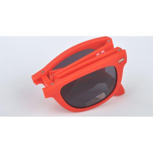 Classic Wayfarer Style Sunglasses with novel folding design. Choice of standard or pantone matched frame in retail grade polycarbonate material. Screen printed to both outer arms. Optional extras include rubberised finish and mirror lenses.