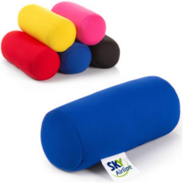 Cylindrical polyester pillow filled with polystyrene beads. Machine washable at 30, not suitable for tumble drying or ironing.