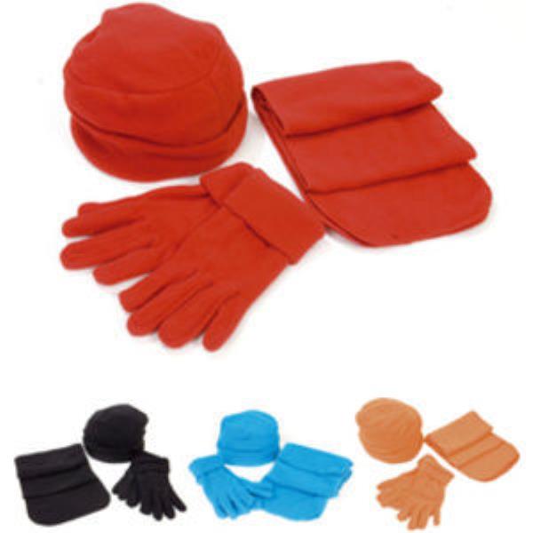 Polar fleece winter set containing a hat, scarf and gloves. 190g/m2. Unisex and one size. The hat and gloves feature thick cuffs to trap heat. Perfect for keeping warm and cosy in winter.