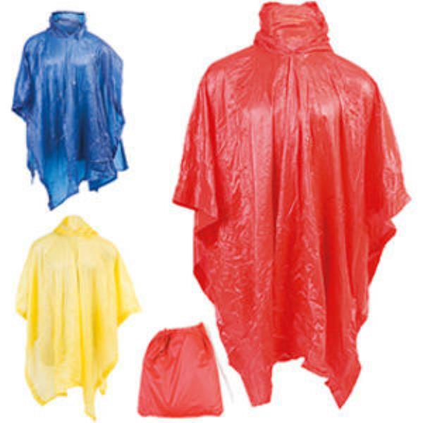 Re-useable poncho with carrying pouch.