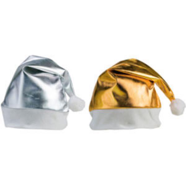 Shiny Christmas hat with white trim and bobble.
