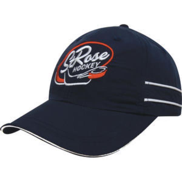 Micro fibre sports with piping and sandwich baseball cap. Unstructured 6 panel, low profile, pre-curved peak, fabric covered short touch strap