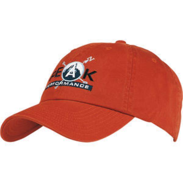 Washed chino twill baseball cap. Unstructured 6 panel, low profile, pre- curved peak, fabric strap and brass buckle and brass slit