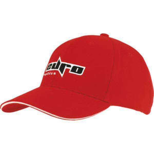 Brushed heavy cotton with sandwich trim baseball cap. Structured 6 panel, low profile, pre-curved peak, brushed cotton under, fabric covered short touch strap