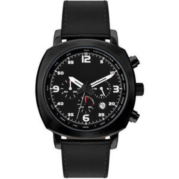 Brushed Black Plated Case, White Luminous Printed Indexes, Glossed Black Dial. Flat Black Natural Leather Strap with Black Stitching.
