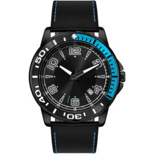 Brushed Black Plated Case & Bezel. White Luminous Printed Indexes, CD Effect Black Sunray Dial. Flat Black Natural Leather w/Blue Stitching.