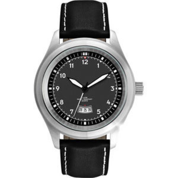 White Luminous Printed Indexes, Matte Black Dial, with Date. Padded Black Natural Leather Strap w/White Stitching.