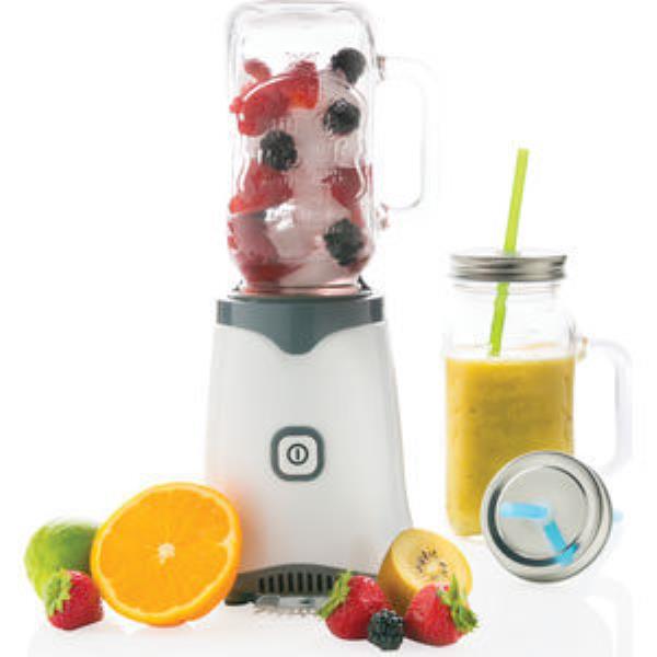 320W blender with two glass 600ml mason jars. Includes drinking lids and straw for easy consumption of drinks.