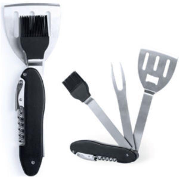 Handy barbecue set in stainless steel material. Functions: corkscrew, capsule cutter, fork, paddle, brush and opener.