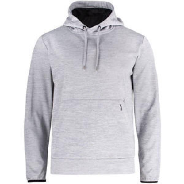Functional and sporty hooded sweater. Comes with a kangaroo pocket and additional hidden pocket with zipper. Hood has mesh lining and a drawstring. Elastic tipping at bottom sleeves. Cuff in shell fabric at bottom. -Fabric: 100% polyester -Gender: Men -Weight: Solid 215 gm2, Melange 240 gm2