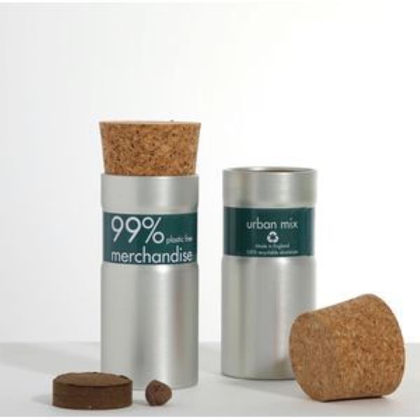 Specially blended flower seed mix for growing in an urban space. Recycled brushed aluminium desktop garden pot comes complete with innovative seedball that will germinate in around 7-14 days. Complete with cork stopper, growing instructions and organic soil coin with full colour label, laser engraving or rotary screen to maximise your logo or message. Available in silver brushed or matt black finish.