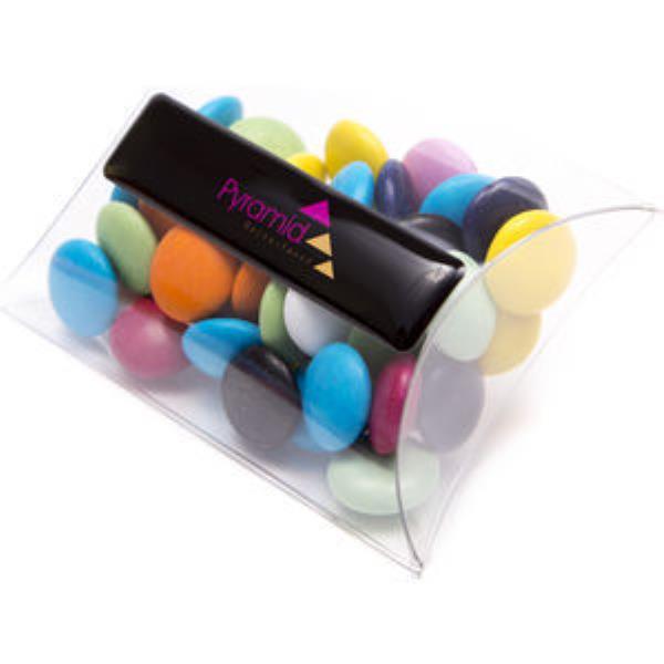 Our clear large pouch, branded with your artwork in full colour on a domed strip or flat label. Filled with your choice of Beanies to match the artwork.