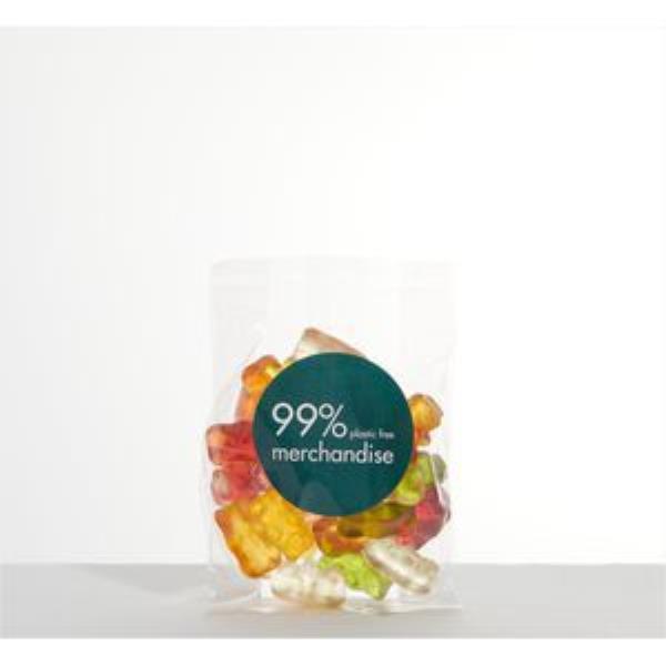 Brightly coloured Haribo Bears in branded compostable/dissolvable sugar cane bag. A large 50g fill with full colour digital label to create an ethical and fun giveaway.