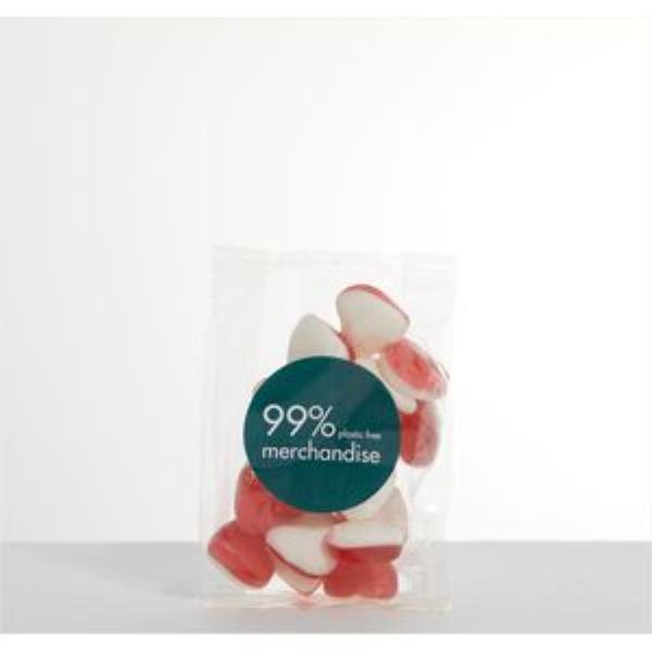 Fun loving Haribo Hearts in branded, compostable/dissolvable sugar cane bag. A large 50g fill with full colour digital label to create an ethical and fun giveaway.