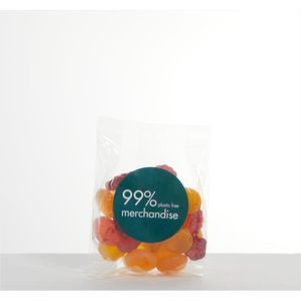 Vegan fruit gums are utterly delicious and totally more-ish. A large 50g in branded compostable/dissolvable sugar cane bag. Full colour digital label to create the ultimate ethical giveaway.