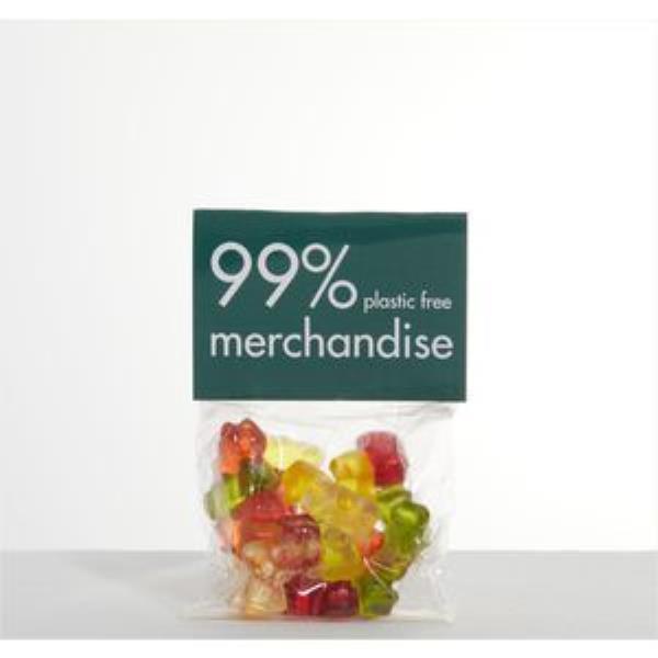 Brightly coloured Haribo Bears in branded compostable/dissolvable sugar can bagt. A large 50g fill with full colour digital label to create an ethical and fun giveaway.