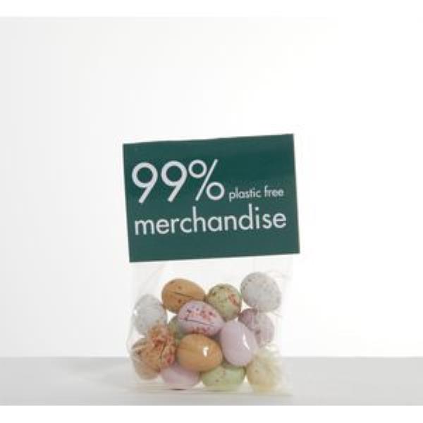Why just keep them for Easter? Chocolate Mini Eggs are a treat at any time of year. A large 50g fill in branded compostable/dissolvable sugar cane bag with full colour digitally printed header card to create a fun and ethical giveaway.