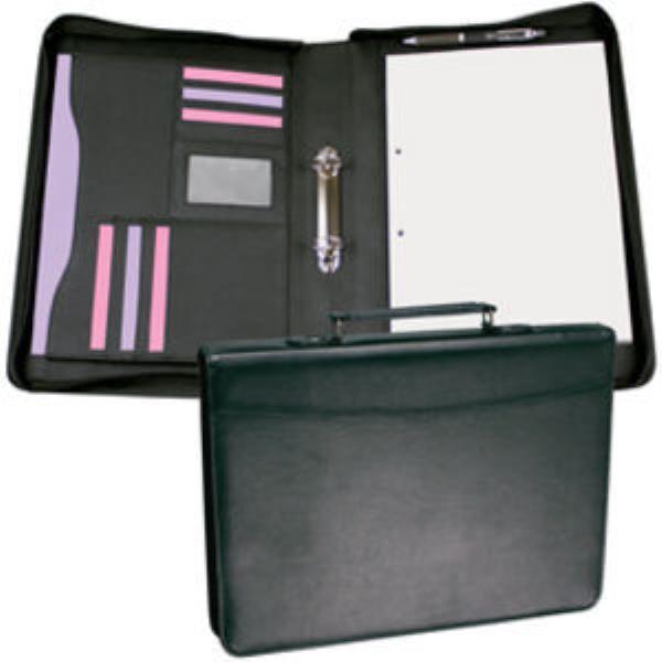 Elegant conference case in a PU leather look material, with zip closure and carrying handle. Several business card pockets, document pockets, disc pocket, pen holder, two ring mechanism and A4 note pad.