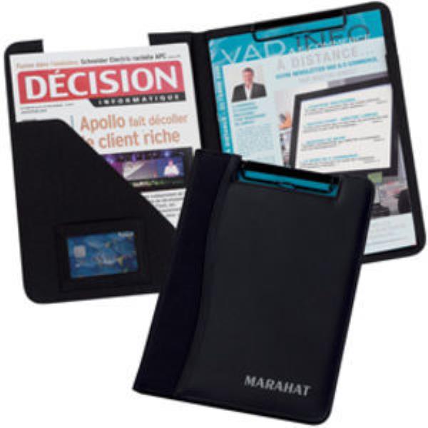 A4 clipboard conference folder with padded 600d polyester and PU cover, internal pocket, business card pocket and pen loop.