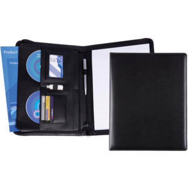 Belluno A4 Deluxe Zipped Conference Folder finished in a black leather look PU with a high quality padded and stitched cover. Interior has a multi pocket lay out with gusseted pocket for notes and brochures & slim laptops. Additional pockets for CD's business or credit card pocketspen loop and flash stick holder. Secured with a high quality easy glide zip. Includes a lined pad.Ideal for emboss or screen print personalisation. Four colour digital transfer also available.