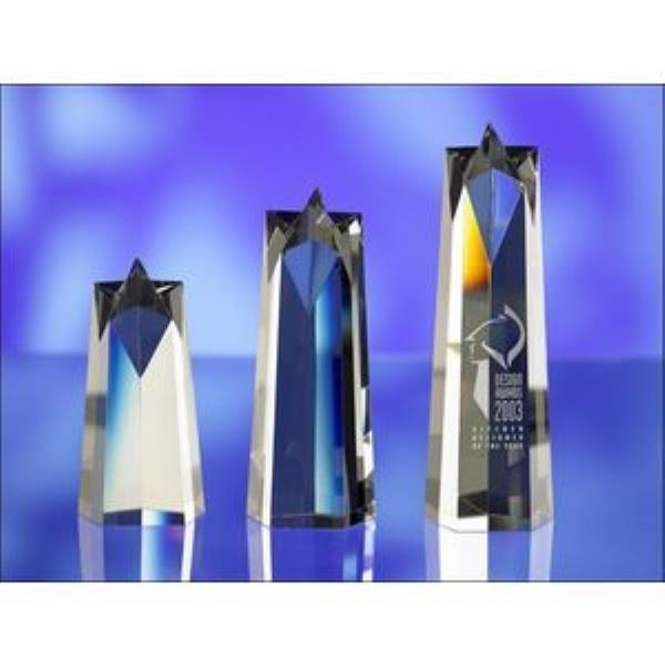 Optical Crystal Glass awards. Size: 178 x 90 x 80mm. Complete with presentation box. Also available in two larger sizes. Engraving set up charges apply.