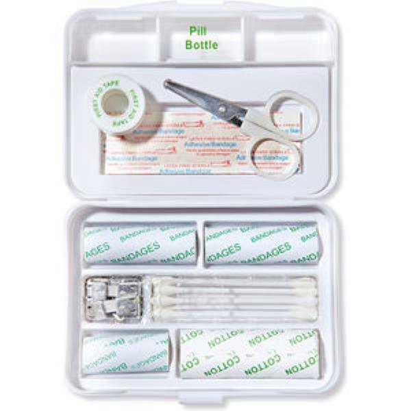 Plastic first aid kit with 9 essential first aid items. Material: Plastic.