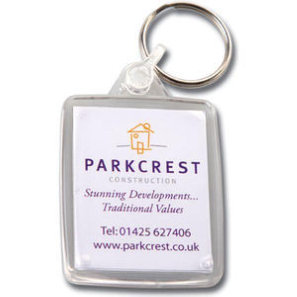 Clear acrylic keyring with full colour printed insert. A choice of 10 coloured fittings available. Perfect for house or car keys - a popular and useful promotional item with a good sized insert for any promotional message