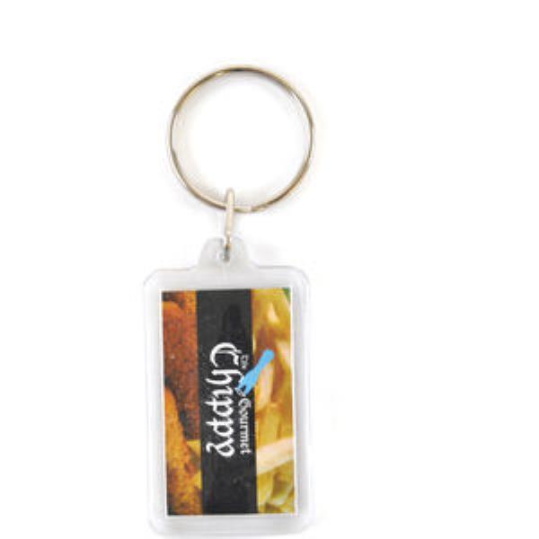 Fully personalised clear keyring up to 45x20 with full colour paper insert logo on both sides. Includes large split ring.