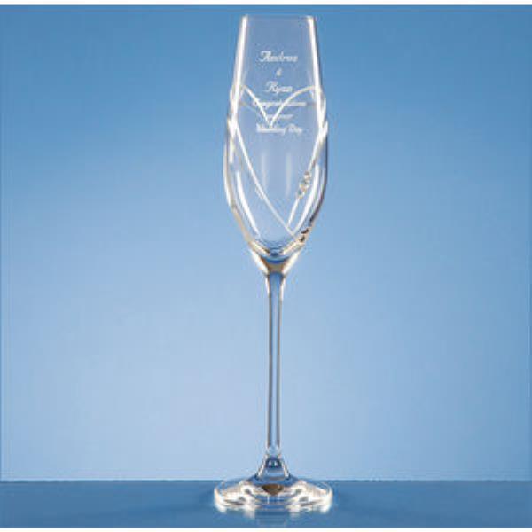 The single champagne flute is decorated with heart shaped cutting and has 3 Swarovski crystals bonded to the glass. The flute has an engraving area where it can be personalised with any crest, logo or wording. It would look great as part of the table wear at any special occasions or presented as a wedding or engagement gift. Print method offered on the product is Sandblast Engraving. Also available Colour Infill print method contact us for details.