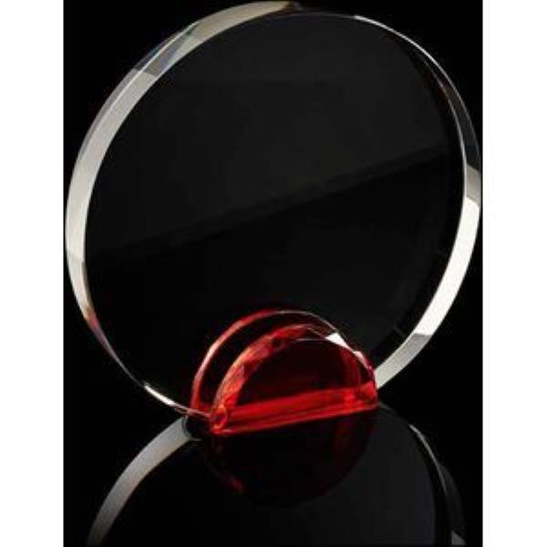 Medium round crystal frame with red crystal stand supplied in a satin lined box.