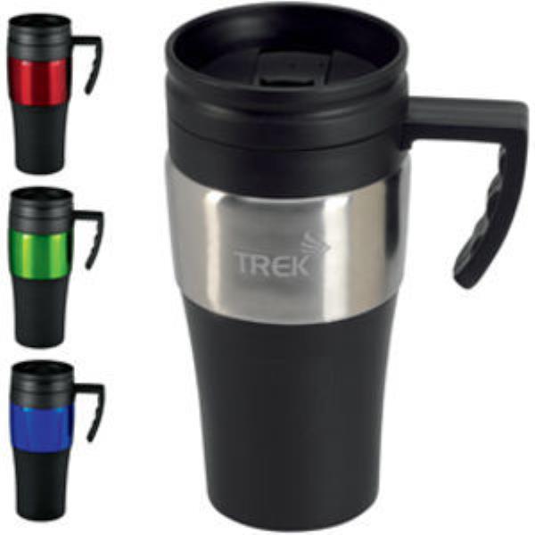 Insulated 0.4 litre mug combining ABS and stainless steel, with drinking lip.