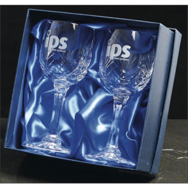 Pair of cut crystal goblets supplied in satin lined box. Perfect executive or anniversary gift