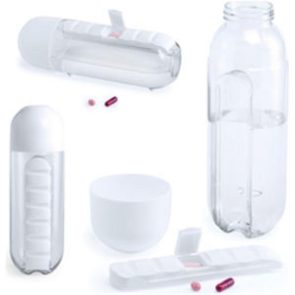 High quality bottle and pill holder. High capacity 730ml, with body in heat resistant (70C), BPA free, tritan material. Integrated weekly pill holder with engraved days of the week. Safety screwon cap doser.